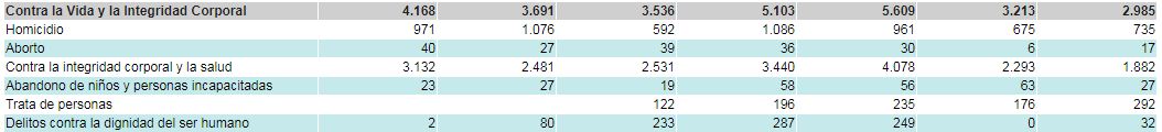 Los homicidios forman parte de los delitos contra la vida y la integridad corporal, que además incluyen al aborto, los delitos contra la integridad corporal y la salud, abandono de niños y personas discapacitadas, trata de personas y delitos contra la dignidad del ser humano.