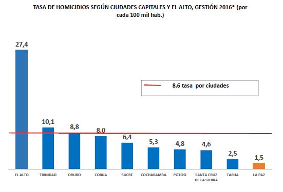 La tasa de homicidios de la ciudad de La Paz es de 1.5 por cada 100 mil habitantes, siendo la media del país 8.6. Por lo tanto, la ciudad se encontraría por debajo del promedio
