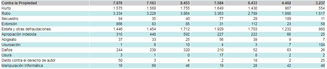 El hurto, robo, estafa, apropiación indebida, usurpación y daños son algunas de las acciones tipificadas dentro de los delitos contra la propiedad. El año 2016 se registraron 3.237 denuncias. De ellas, 1.517 corresponden a robo.