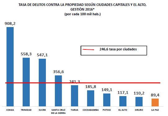 La tasa de delitos contra la propiedad equivale a 89.4 por cada 100 mil habitantes. En cuanto a robo agravado, la tasa del municipio es de 14.7; de robo es 33.4, hurto 41.3. Si la tasa nacional de delitos contra la propiedad es de 246.6, el municipio paceño está ubicado muy por debajo de la media nacional