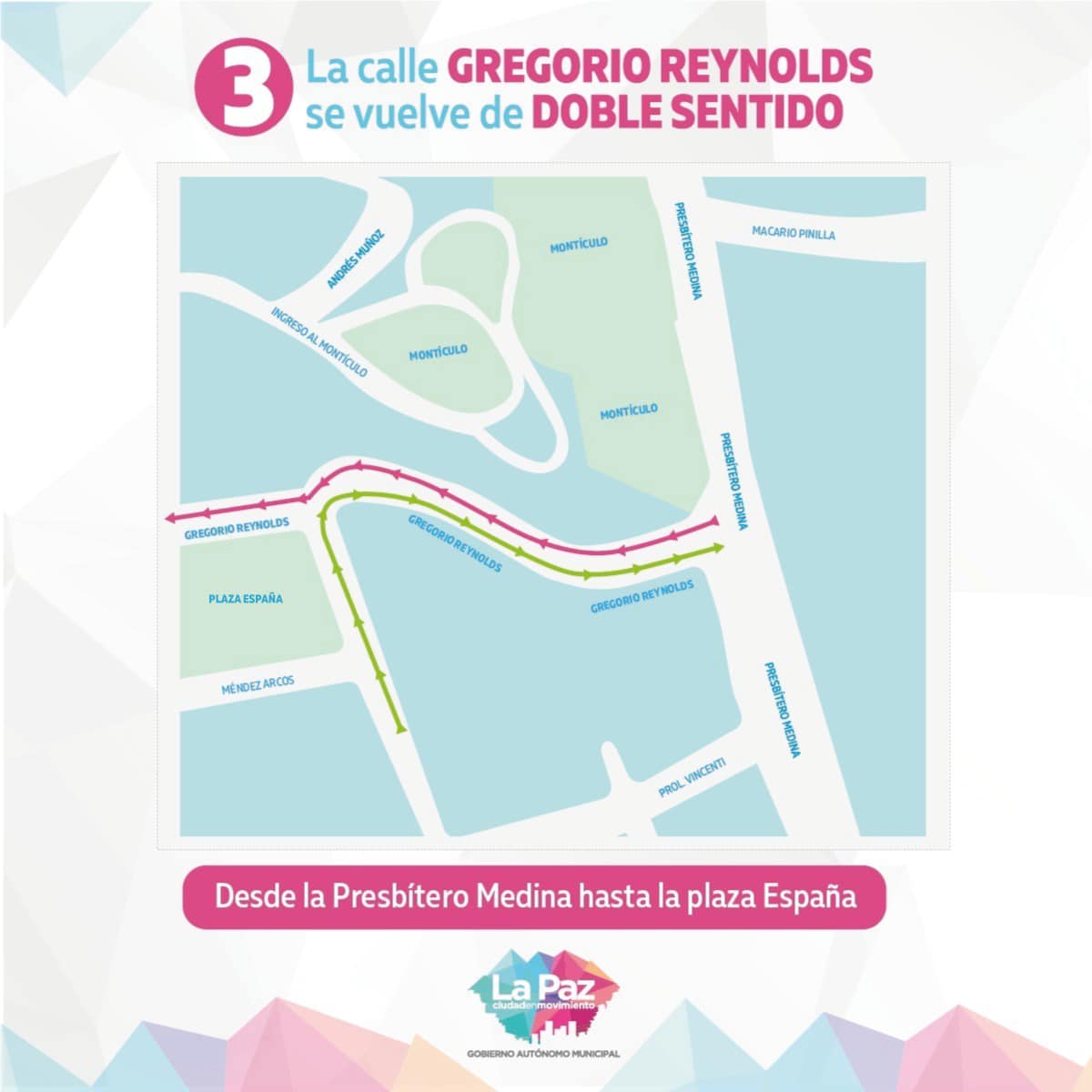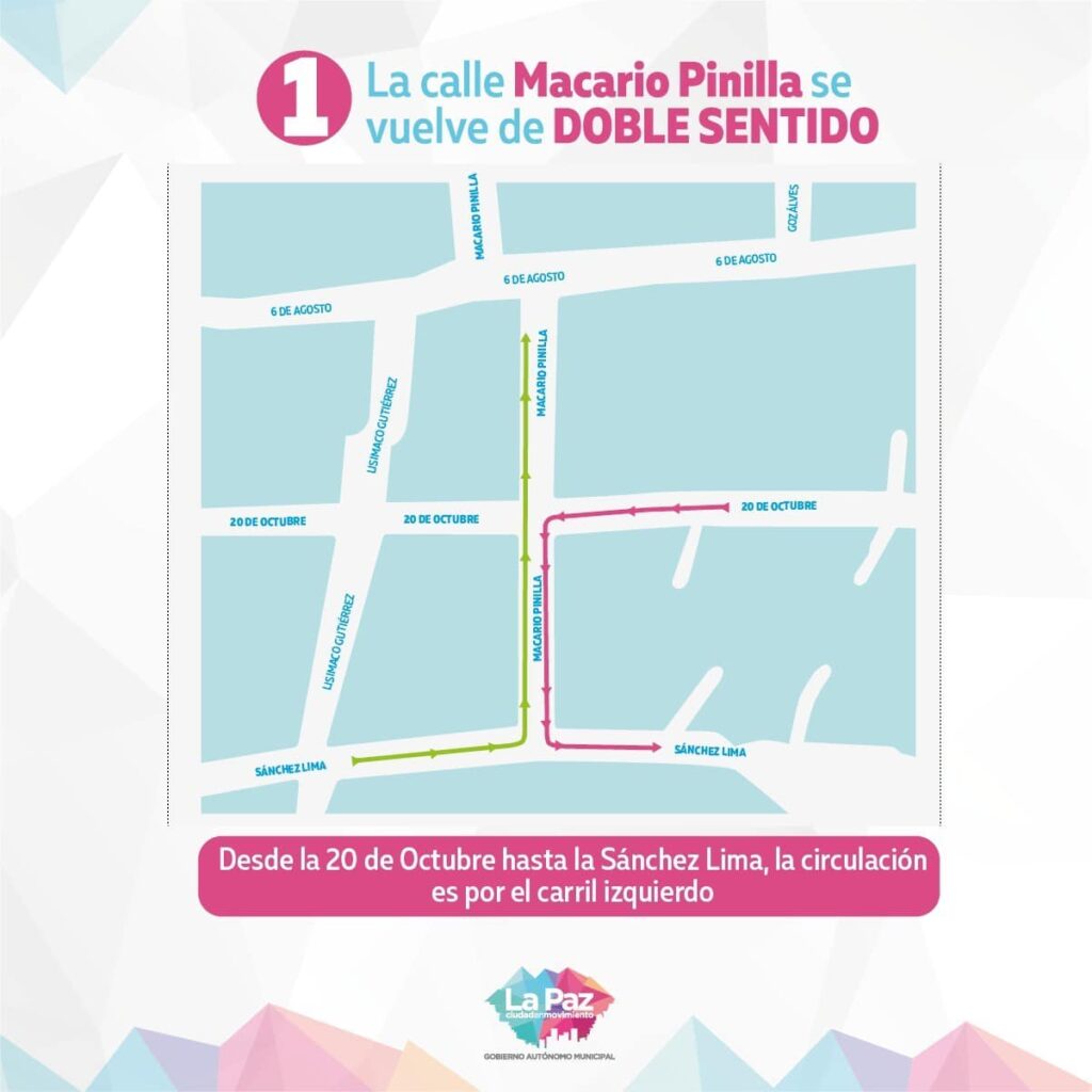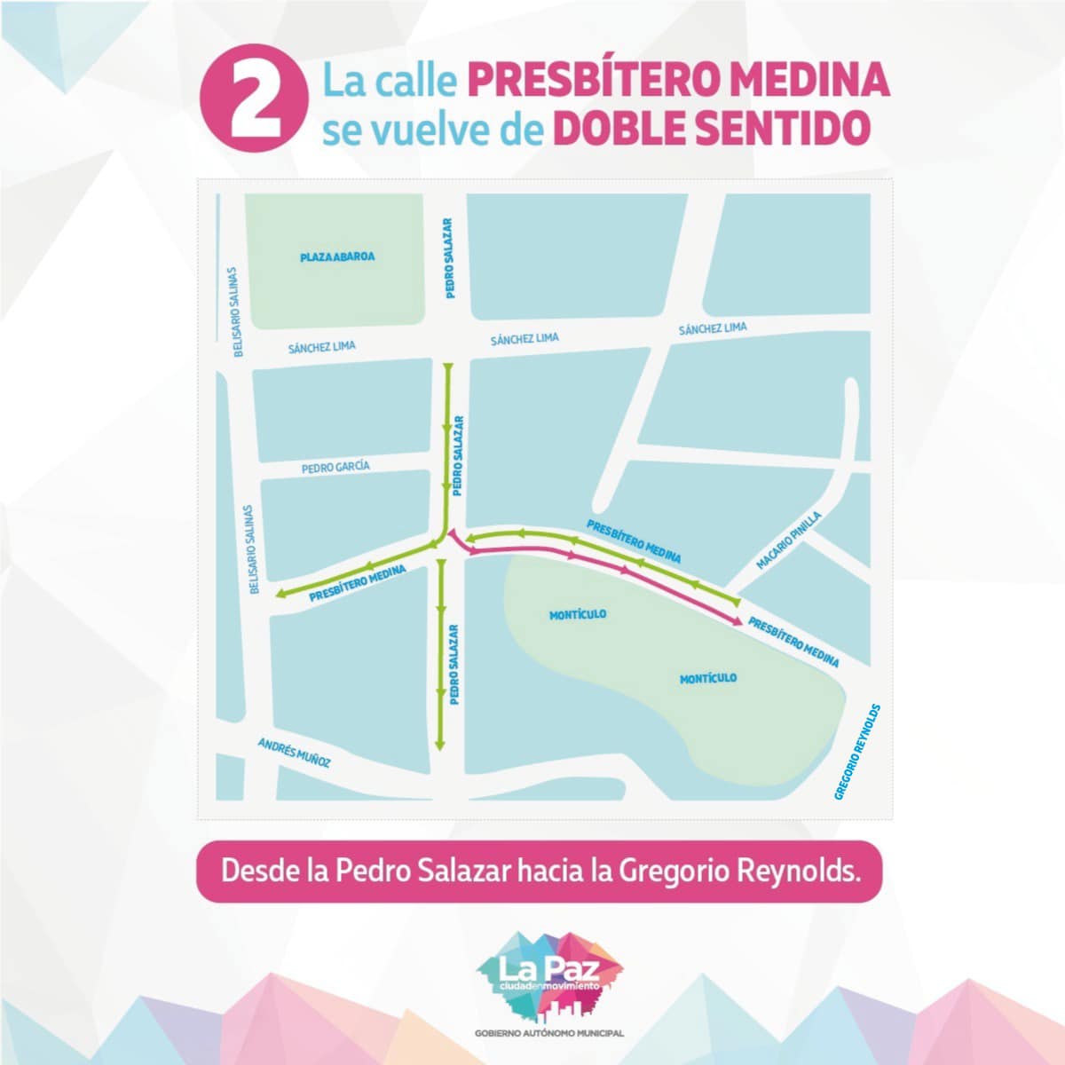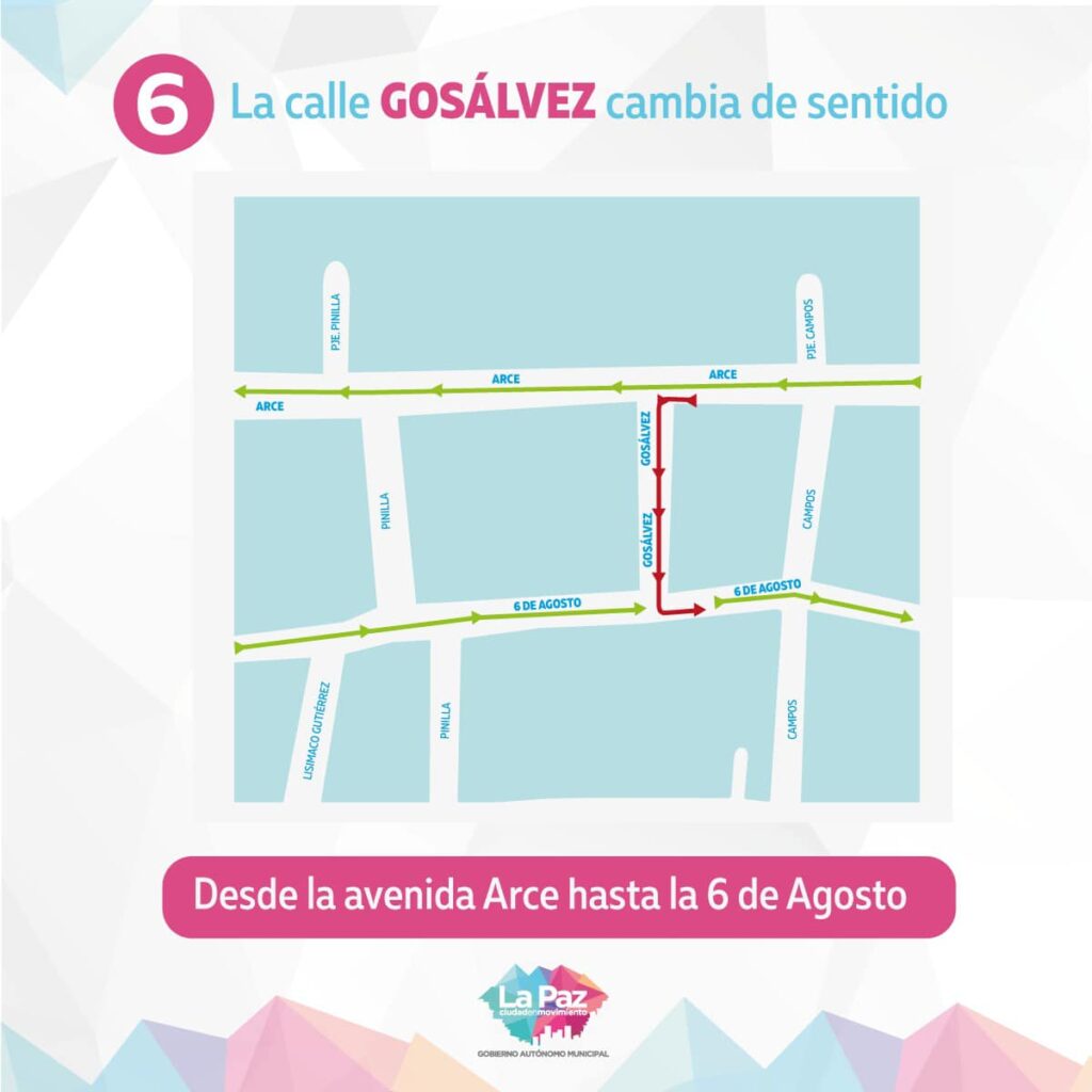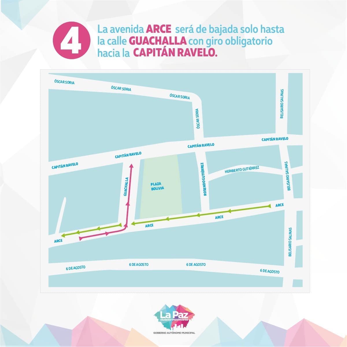 “Informarles que tenemos seis cambios de sentido en la zona de Sopocachi. La Av. Arce tenía un carril de bajada desde la plaza del Estudiante hacia la Isabel La Católica, hemos restringido este carril de bajada solamente hasta la calle Guachalla donde se van a poder reincorporar los vehículos hacia la Capitán Ravelo para luego dirigirse hacia Miraflores a través del Puente de las Américas”, informó Luis Alemán, director de Ordenamiento y Regulación de la Movilidad, dependiente del Gobierno Autónomo Municipal de La Paz (GAMLP).