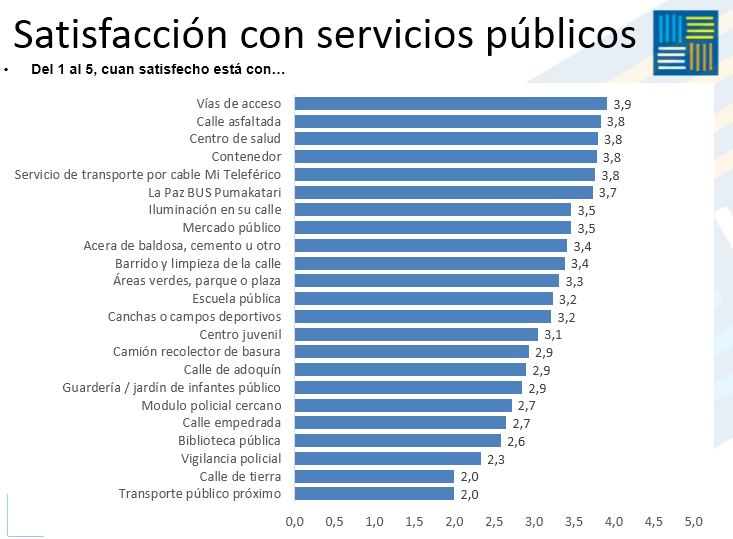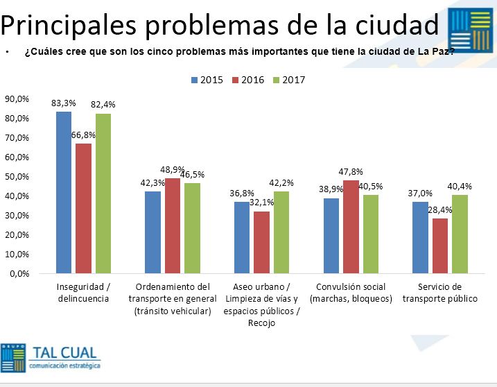En las diferentes Encuestas de Percepción Ciudadana del Observatorio La Paz Cómo Vamos se evidenció que la población no está satisfecha con el servicio que brinda el transporte público. Por ejemplo, el año 2017, la población lo puntuó con una calificación de 2 puntos sobre 5.